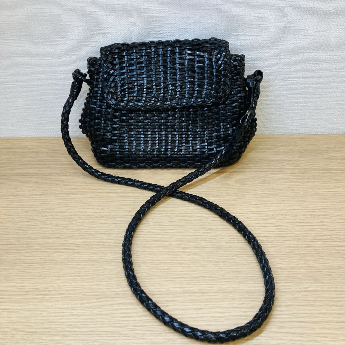 - O25154 WIND MAIL ウィンドメール 革 レザー 編み込み 籠 カゴバッグ ショルダーバッグ 黒 ブラック