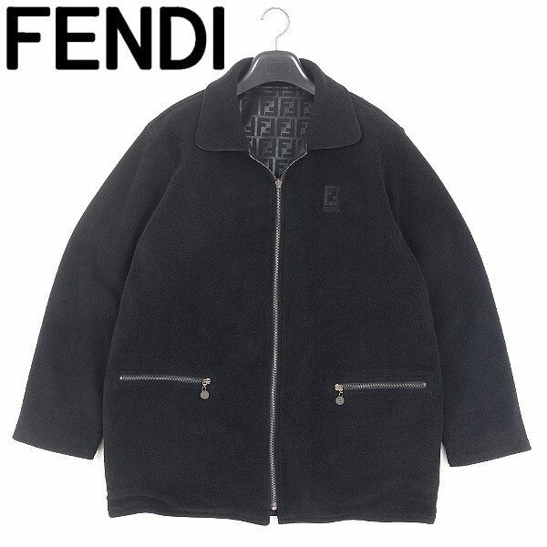 > 【HA155】ヴィンテージ◆FENDI jeans フェンディ ボア&ズッカ柄 リバーシブル ロゴ刺繍 ジップ ジャケット 黒 ブラック