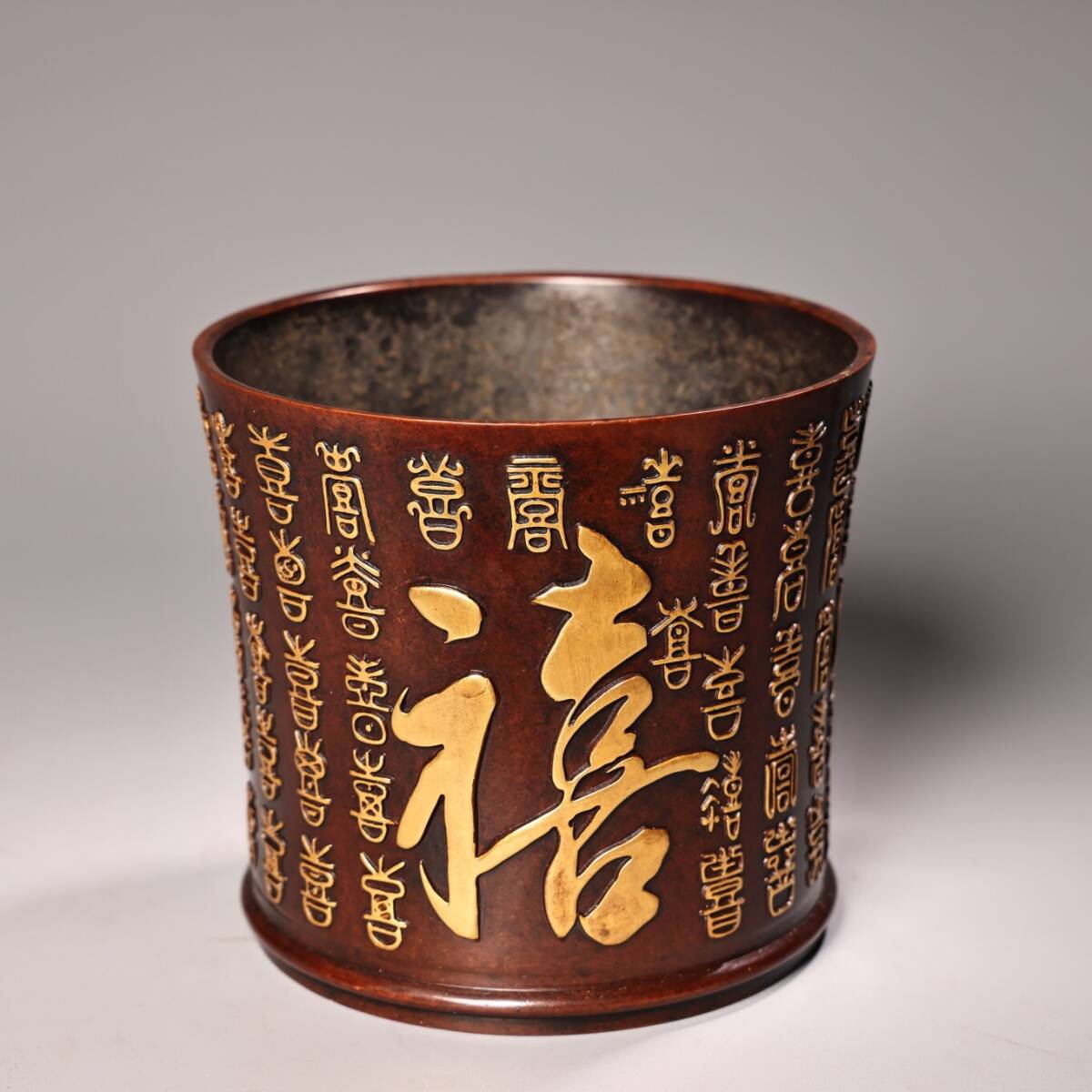 - 【超珍館蔵】紫銅製 塗金 福祿寿喜紋 筆筒 置物 文房賞物 古賞物 古董品 古美術品 時代物 旧家蔵出 稀少珍蔵品