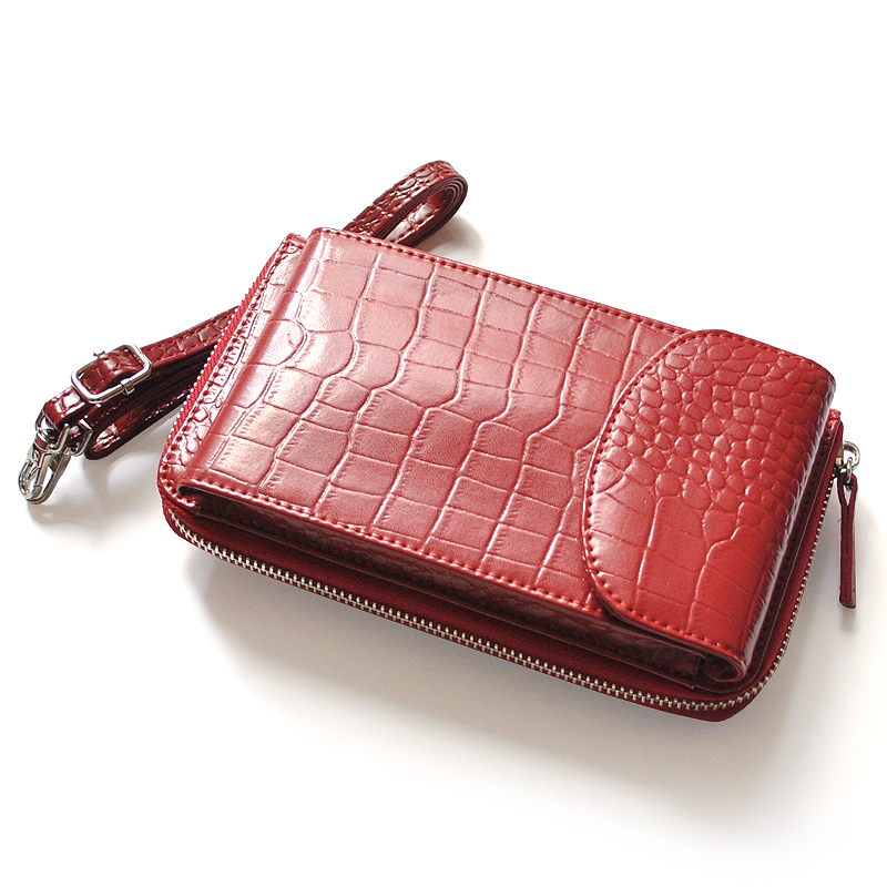 - 牛革クロコ型押し財布機能付きスマートフォンポーチ No.3170■レディースカラバリ牛革ポーチ レッド×1個