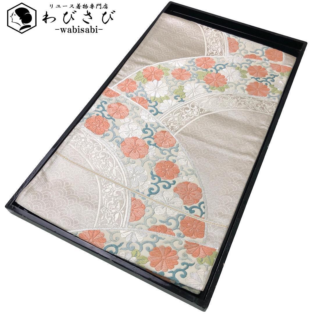 > 袋帯 花唐草模様 青海波 銀色 唐織 銀糸 O-5436 着物 きもの kimono 和服 和装 中古 リサイクル着物 【送料無料】