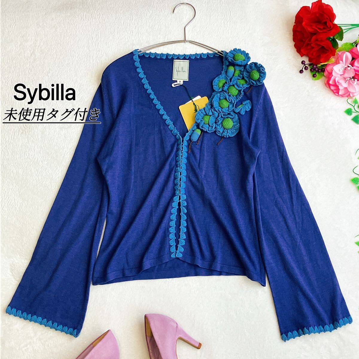- 【未使用タグ付き】シビラ Sybilla★フレアスリーブ 薄手 カーディガン フラワーモチーフ Vネック コットン レーヨン パープル×ブルー