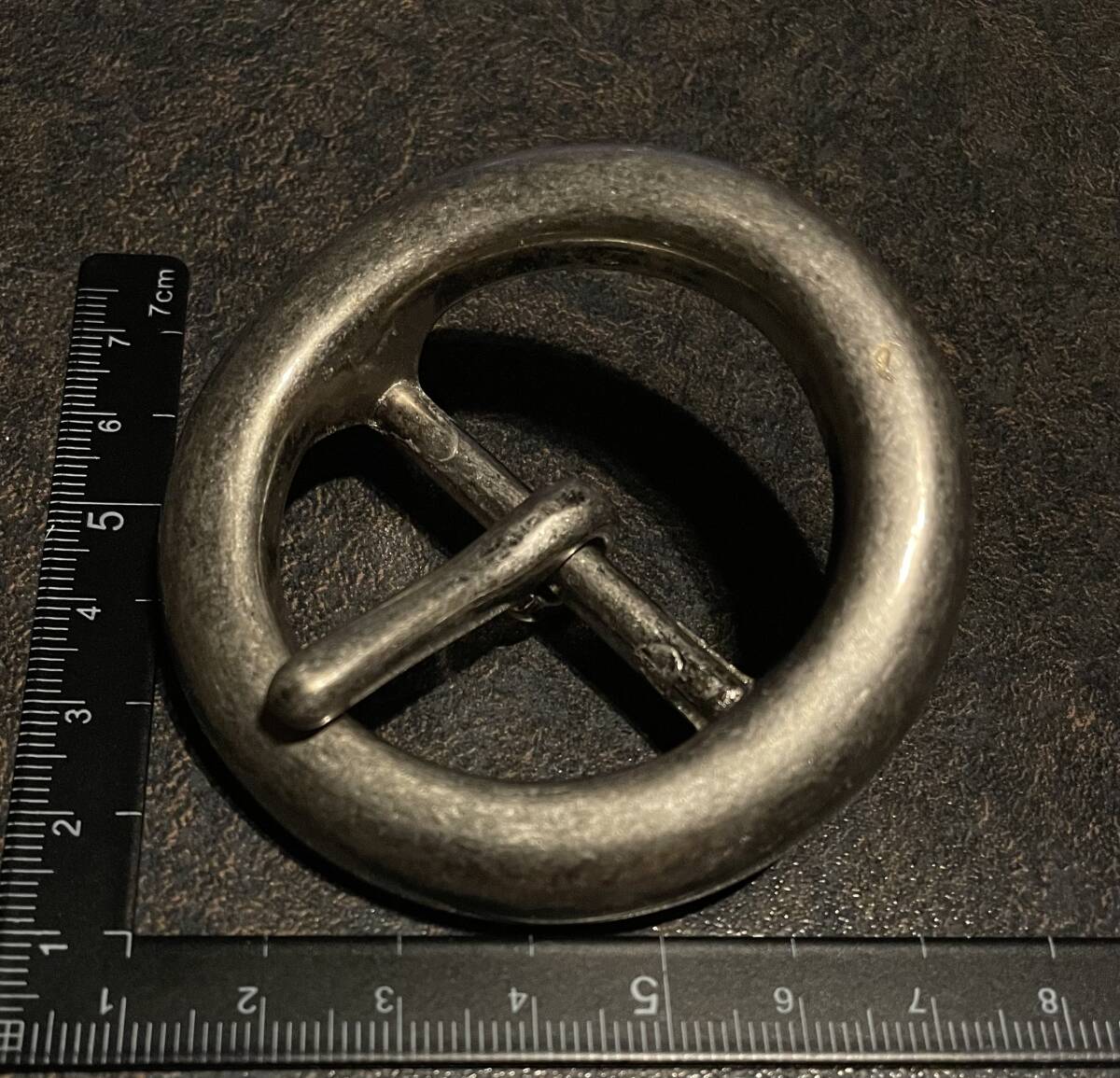 - 重厚デッドストック90sオールド太リング型バックル半円 丸デザイン燻し銀シルバー色アンティーク加工エイジング経年ベルト90年代ビンテージ