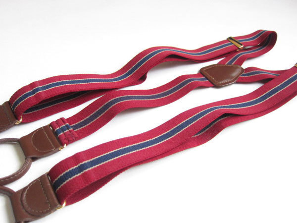 - PELICAN-USA/伸縮素材ストライプ×レザー/ボタンタブ式/Y型 サスペンダー/エンジ系/メンズ/Yバック/長いサイズ/ブレイシーズ/ビジネス/D86