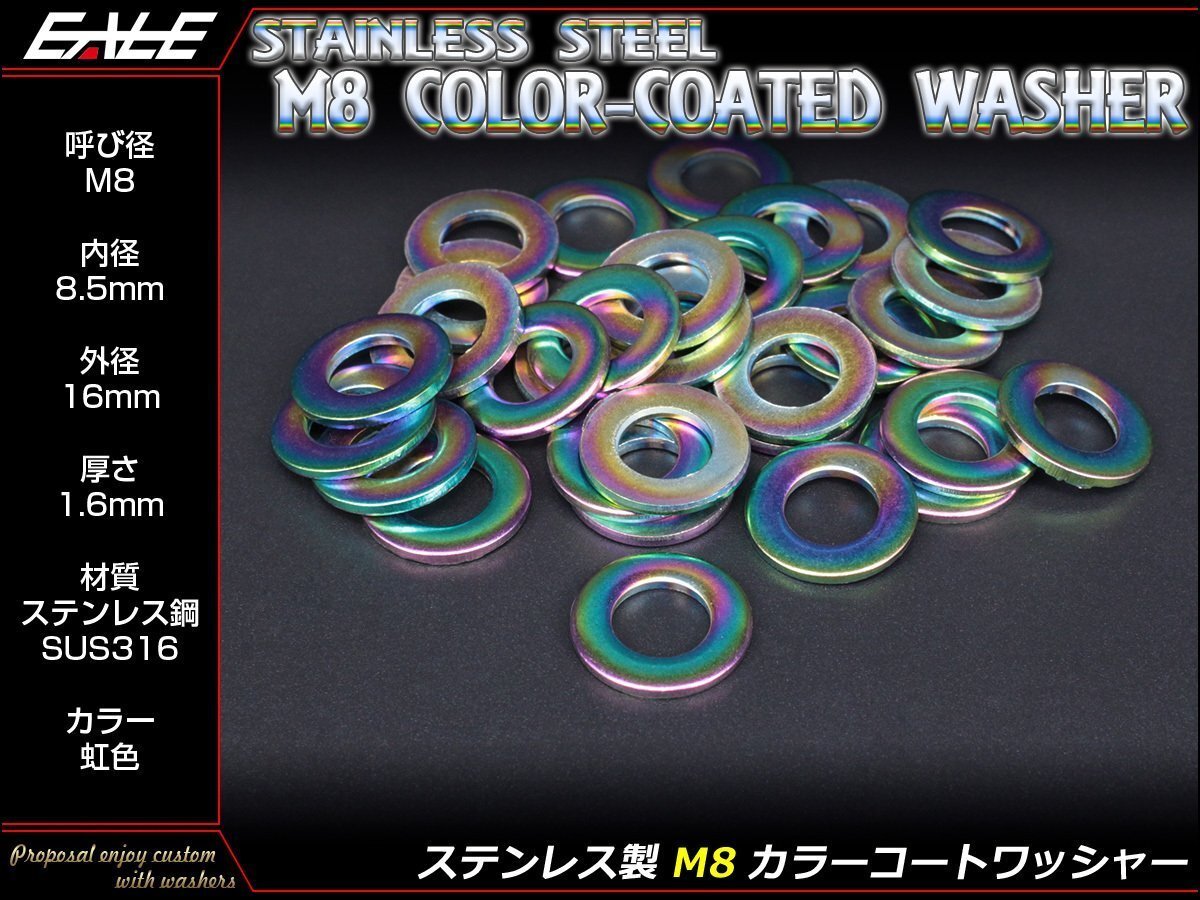 - ステンレス製(SUS316) M8用 カラーコートワッシャー 平ワッシャー 外径16mm 厚さ1.6mm 焼チタン風 虹色 JA002