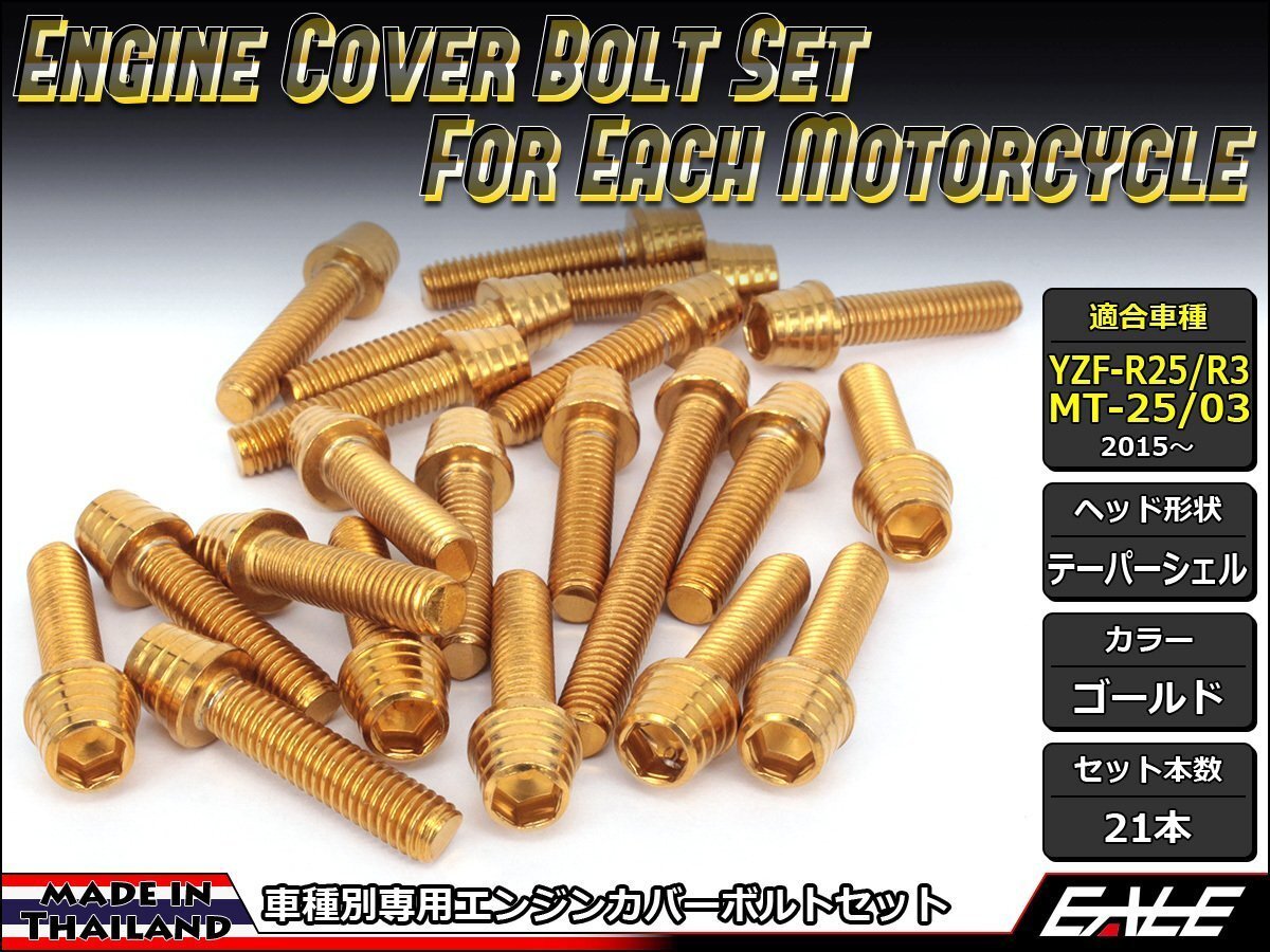 - YZF-R25/R3 MT-25/03 エンジンカバー ボルト21本セット ステンレス製キャップボルト使用 テーパーシェルヘッド ゴールド TB7027