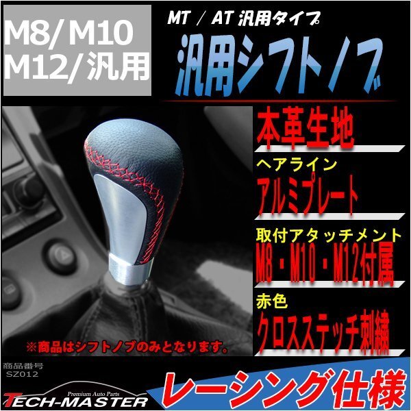 - シフトノブ MT/AT 汎用 レザー生地 レッドクロスステッチ アルミプレート ヘアライン レーシング仕様 SZ012