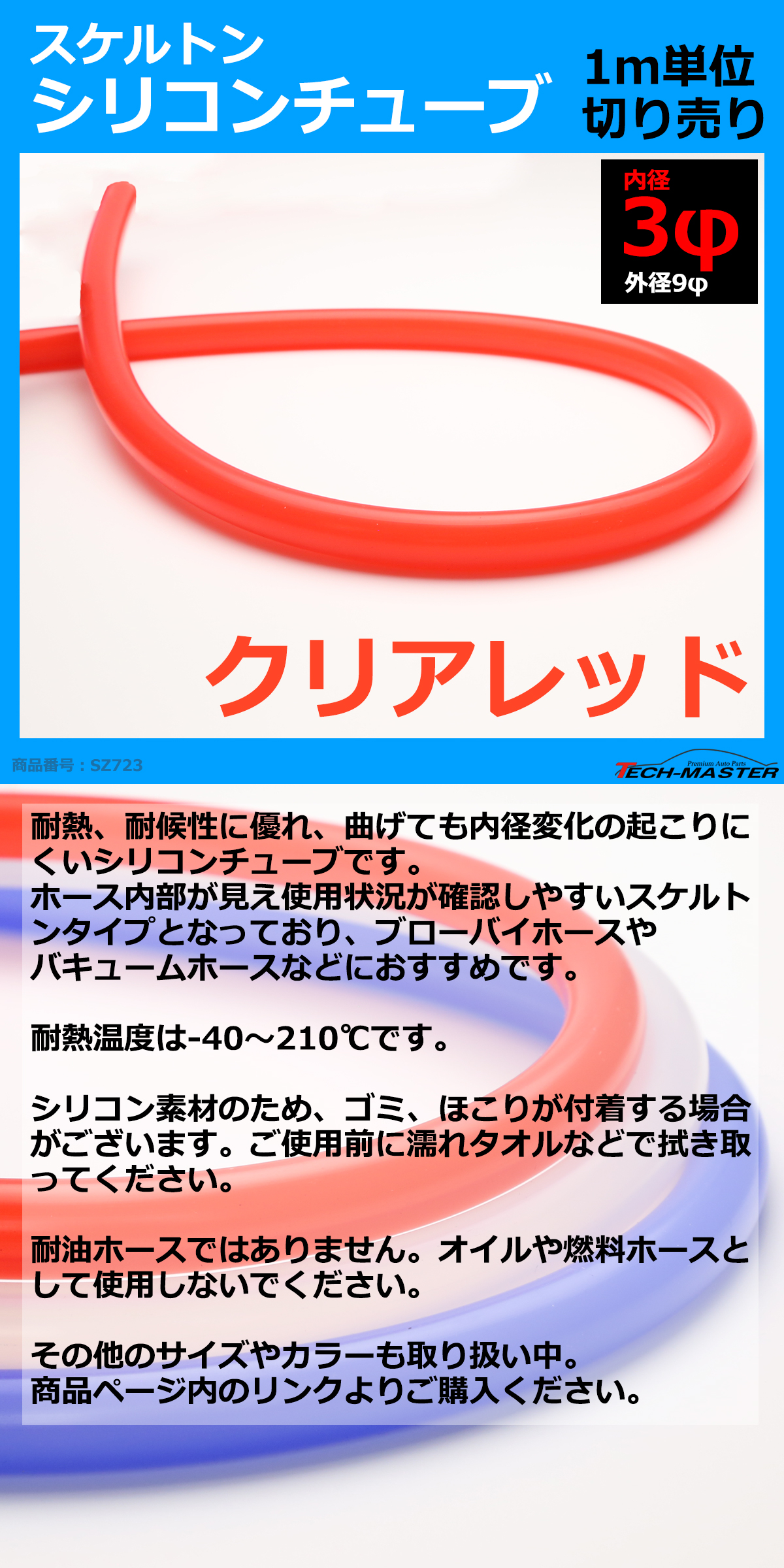 - 3φ スケルトン シリコンチューブ クリアレッド 内径3mm 外径9mm 半透明 シリコンホース SZ723