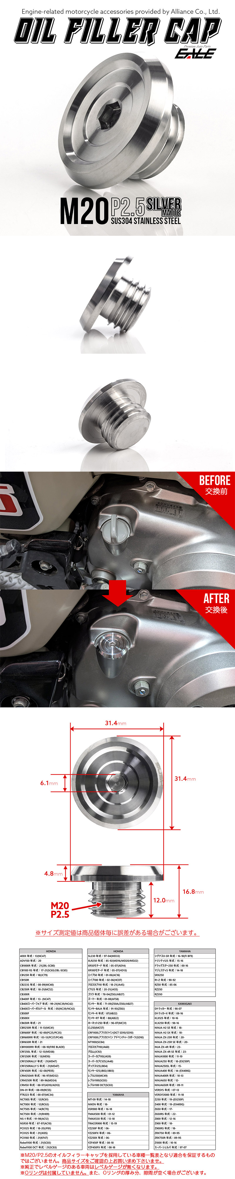 - オイルフィラーキャップ M20 P2.5 六角穴 ステンレス製 マットシルバー 汎用 TH0477