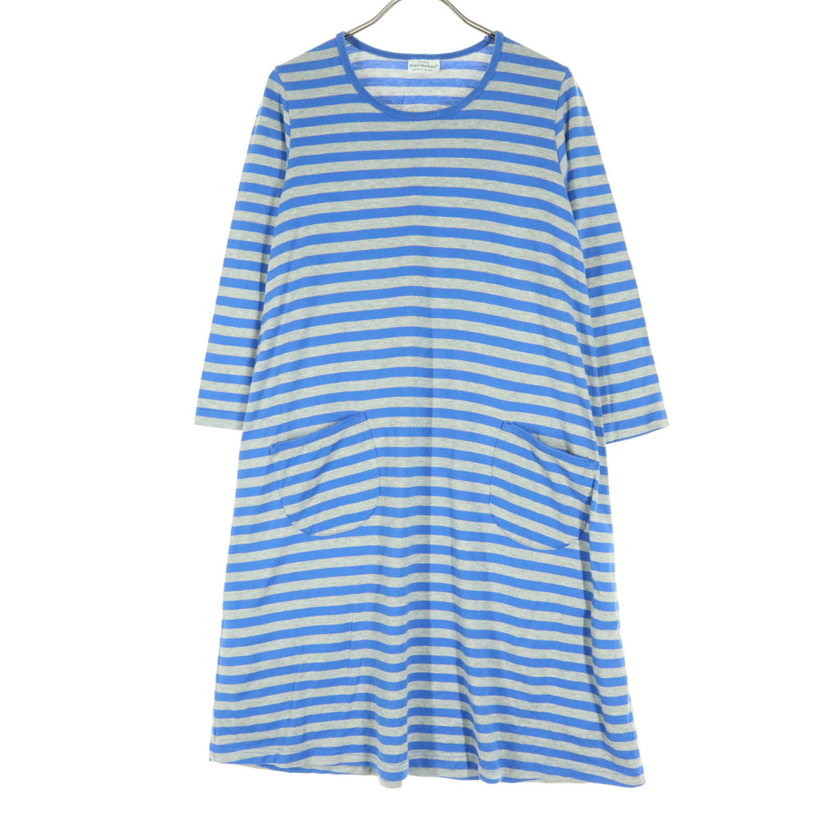 > marimekko マリメッコ フィンランド製 ボーダー柄 長袖 膝丈ワンピース ブルー ルームウェア レディース
