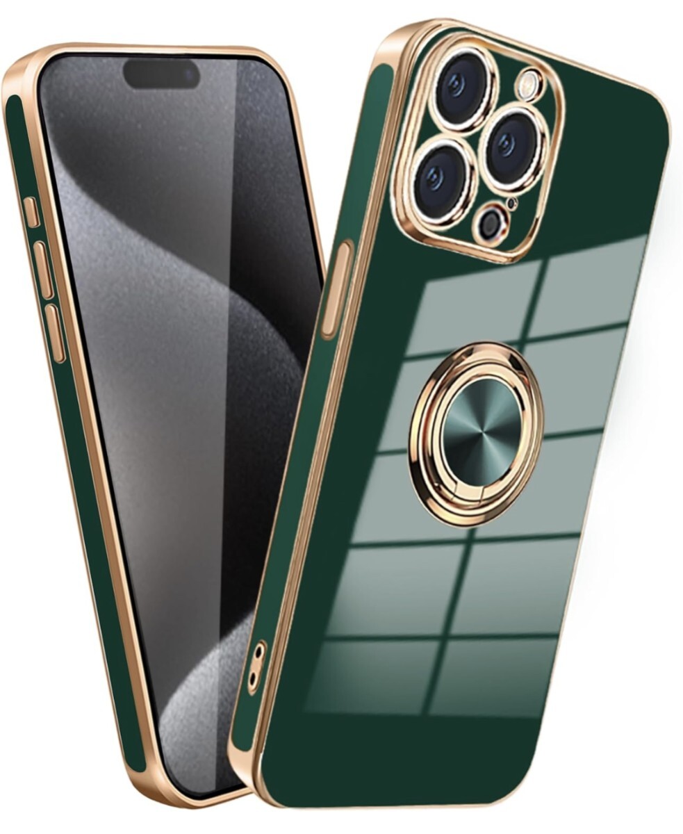 - iPhone 15 ProMax アイフォン 15 プロマックス ケース リング 耐衝撃 リング付き スマホケース メッキ加工 カバー ダークグリーン 緑
