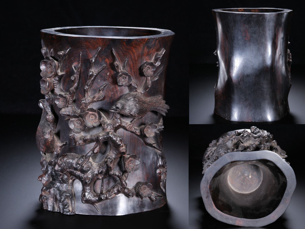 - 「清時代 紫檀の木 彫り 喜上眉梢 筆筒」極細工 擺件 賞物 古美術 骨董品 旧蔵出