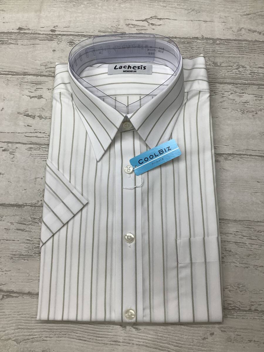 - 新品未使用 39Mサイズ半袖 定価4,900円★レギュラーカラー カッターシャツ ストレッチ素材 ★ストライプ 白生地 オリーブ色ライン