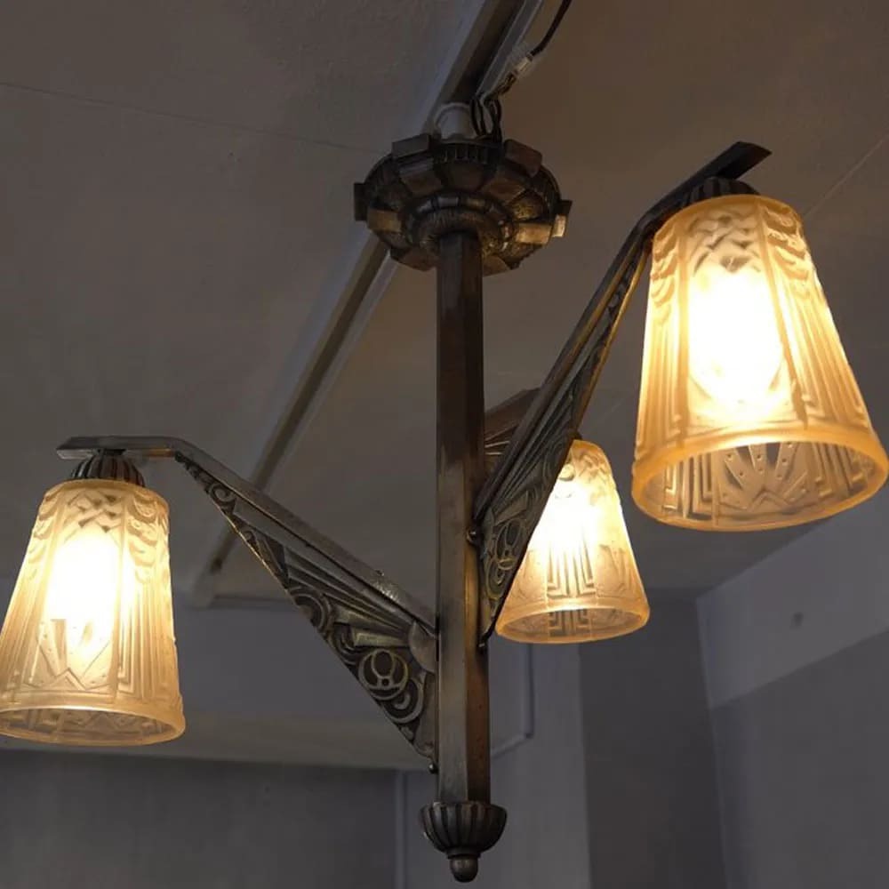 - 【華麗なアールデコ Muller作 天井灯】ランプシャンデリア3灯ミューラー孔雀幾何ガラスシェードインテリアフランスアンティーク照明