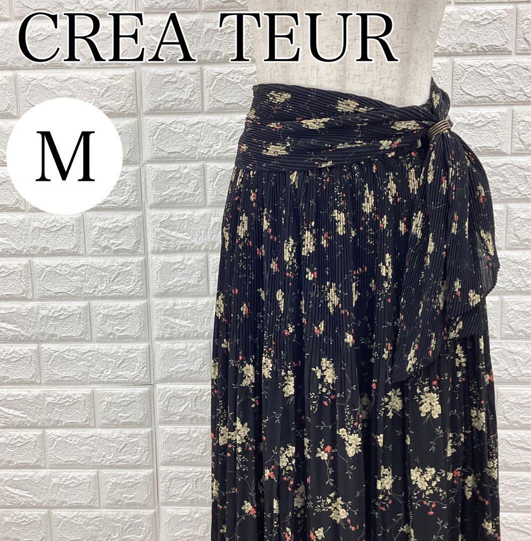> 【AA4317】 CREA TEUR クレアトゥール プリーツスカート Mサイズ ウエストリボン ロング 花柄 ウエストゴム ブラック 総柄