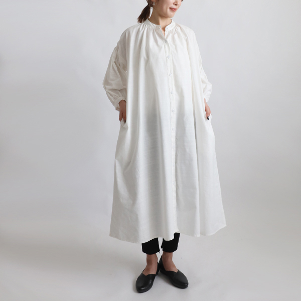 - 秋/最終SALE ギマ擬麻コットン 贅沢ギャザー ゆったり スモック 前開き ロング ワンピース パフ袖 羽織り ホワイト U63