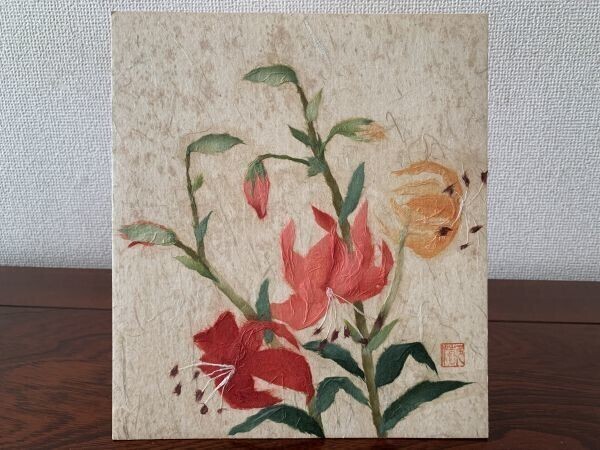 - ★【色紙画/色紙書】 ちぎり絵 和紙 『ヒメユリ』 一字書/水墨画/詩/短歌/俳句/情景画 《色紙3枚以上送料無料》 K0326E31