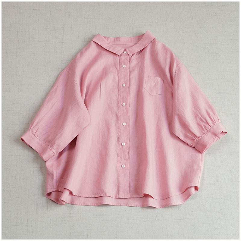 - 新品チュニック ワイシャツ トップス 麻100% ふんわり ゆったり オシャレ フリーサイズ ナチュラル 通気性手触り抜群 純色 ピンク