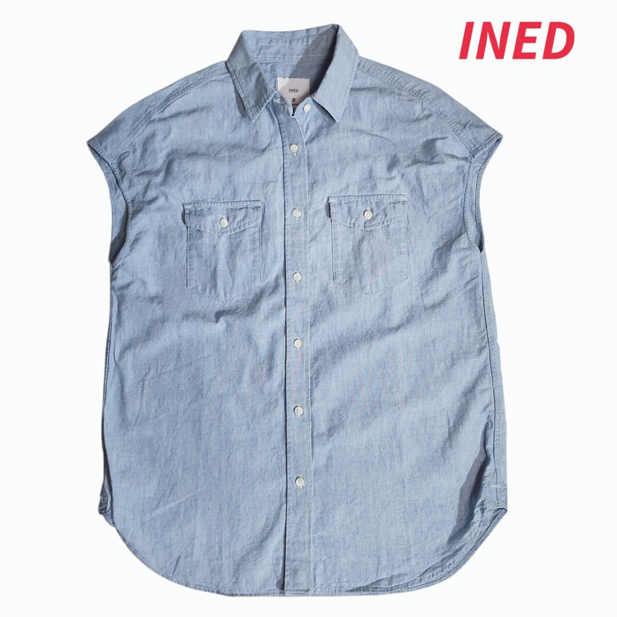- INED シャンブレー生地 フレンチスリーブ 半袖シャツ 表記サイズ9号 M ライトブルー 背面ギャザー ゆったりめ 68966