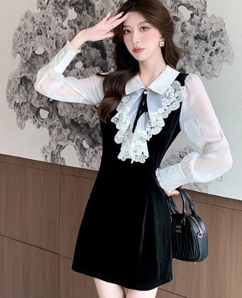 - ミニワンピース 長袖 フリル レトロ かわいい ガーリー レディース M ブラック