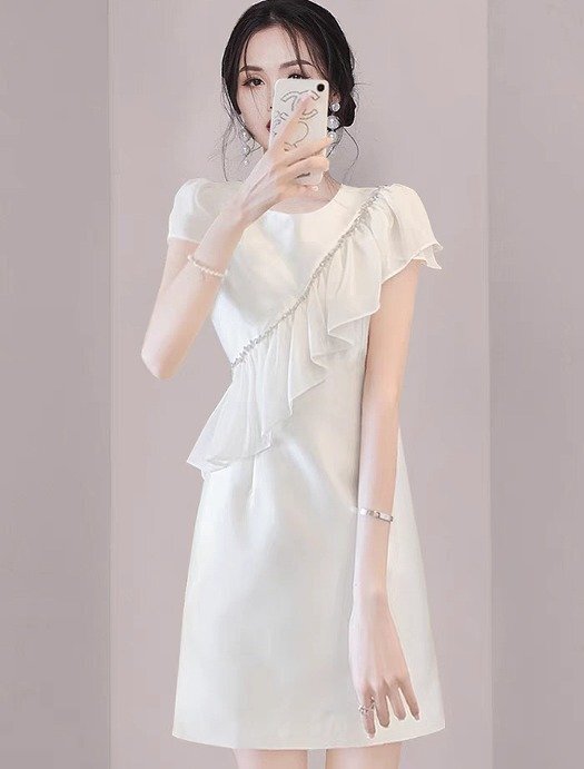 - ワンピース フリル 切り替え スリム 着痩せ sweet系 L ホワイト