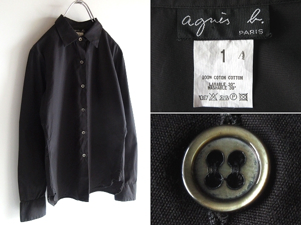 > 希少 90sビンテージ agnes b. アニエスベー コットン レギュラーカラーシャツ ブラウス 1 黒 ブラック 日本製 ネコポス対応