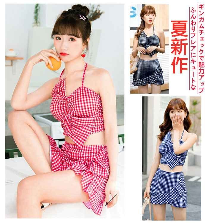 - 夏 レディース ビキニ 2点セット水着 チェック柄 ふんわり 可愛い ノンワイヤー M レッド