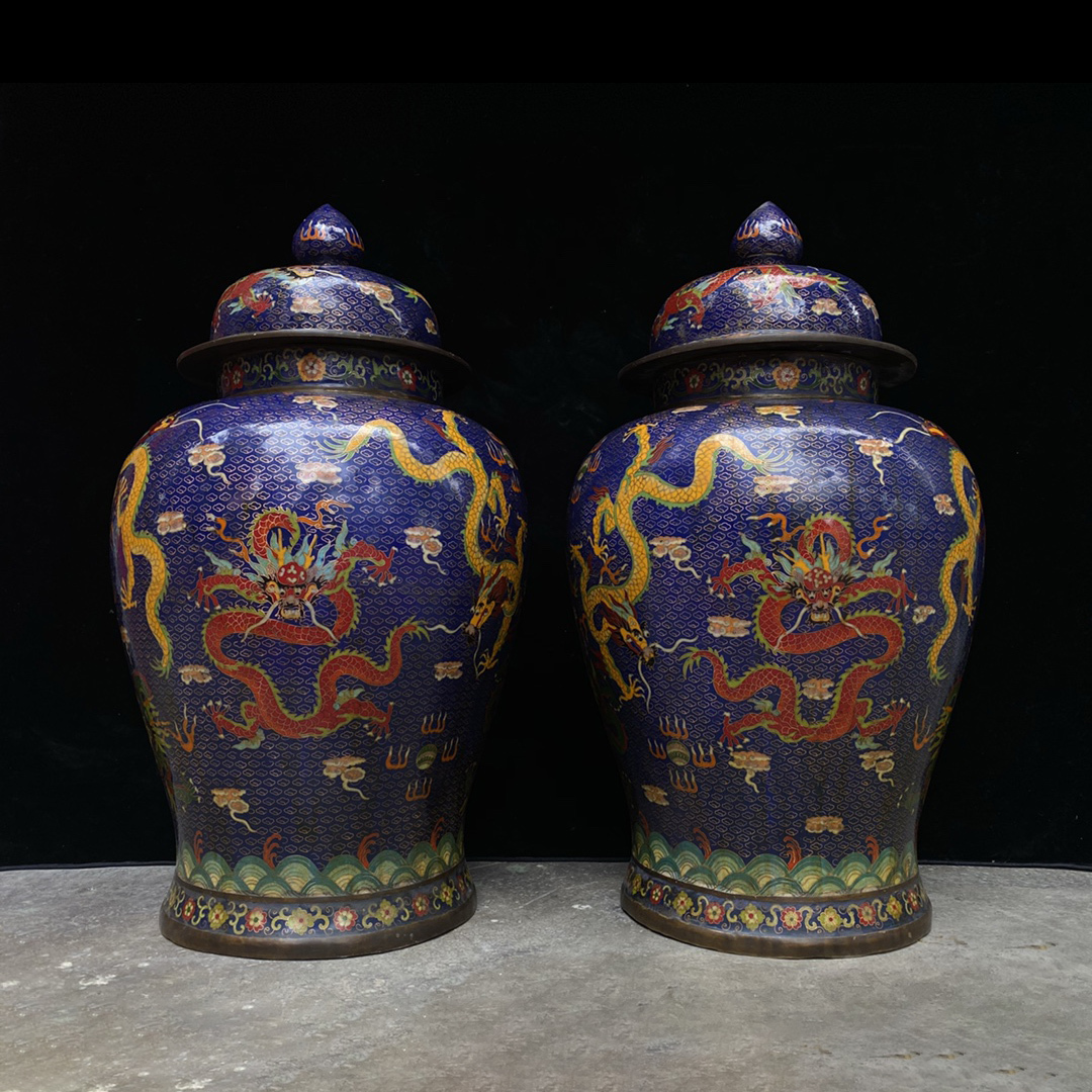 - 9_ZZ8414【惠】人間国宝 中国古美術 中国骨董 銅製品 【景泰藍純銅九龍将軍缶です】 時代物 置物 珍品旧蔵 伝世家珍