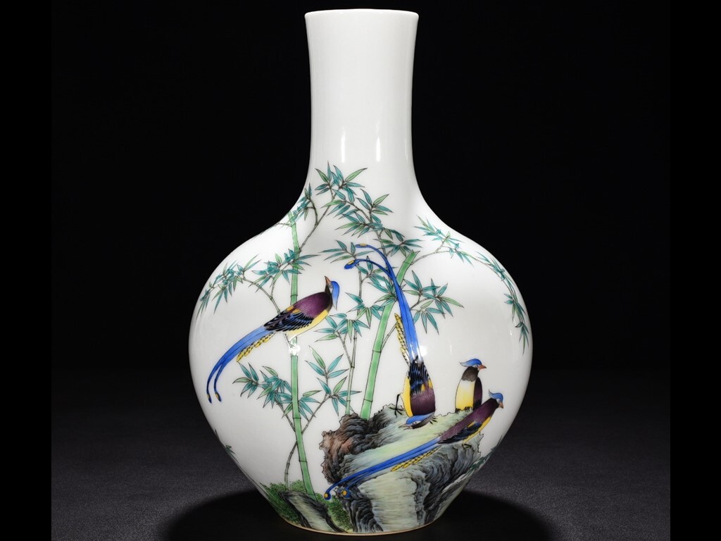 - TD177■中国古玩 唐物 大清乾隆年製 款 琺瑯彩壽帯鳥竹子紋天球瓶 時代物 極上品■高さ33.5cm直径22cm■