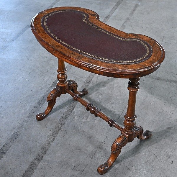 > 英国アンティーク キドニーテーブル マホガニー無垢材 レザートップ 肝臓型 サイド ナイト エンド リビング ダイニング 寝室 書斎