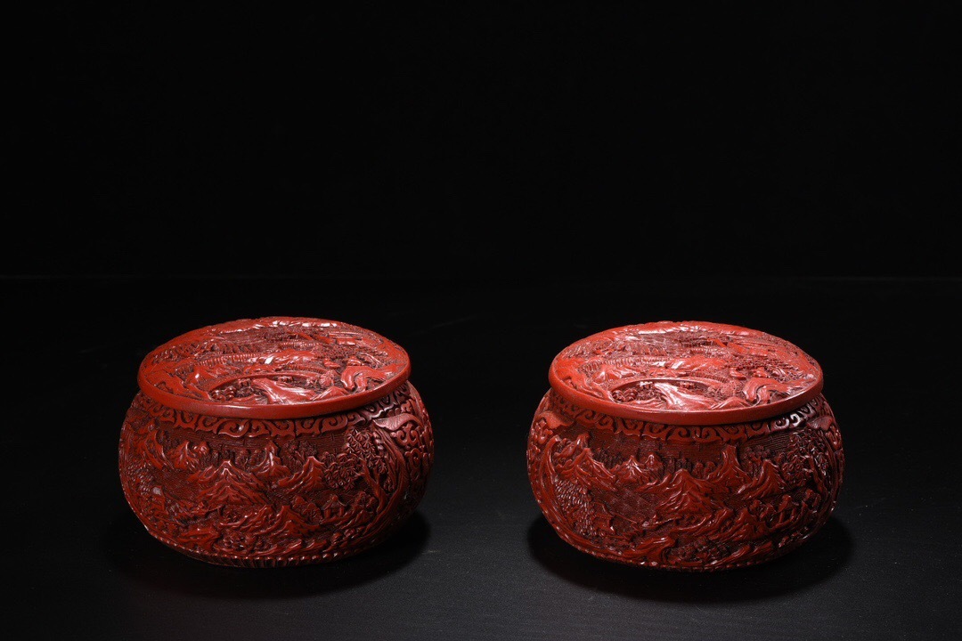 - 蔵友旧蔵出 剔紅漆器彫 山水図 圍棋罐一對 供養品 置物擺件 古賞物 中国古玩 中国古美術品