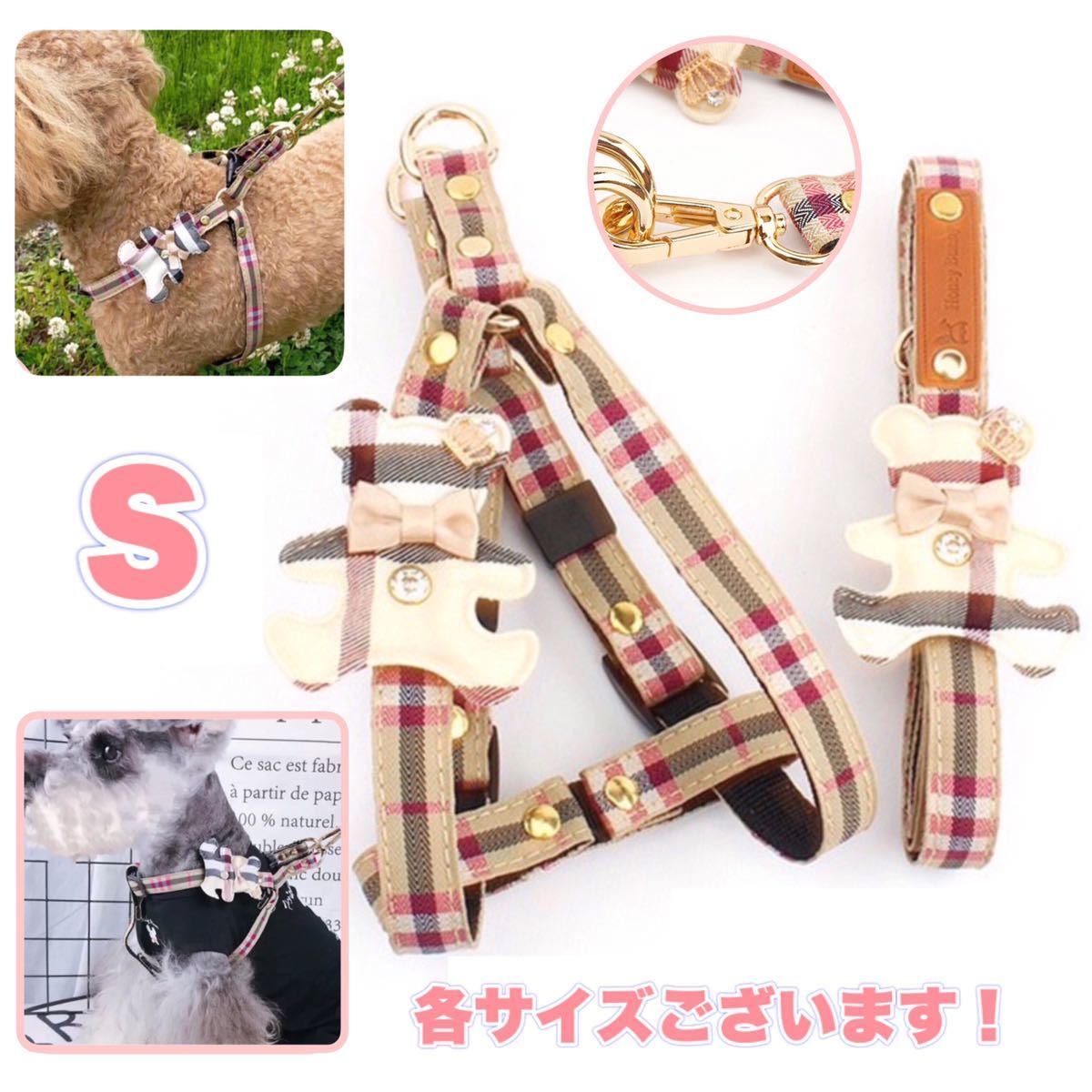 - 犬 ハーネス チェック柄 熊 モチーフ 犬用 Sサイズ リード セット S おしゃれ かわいい お出かけ お揃い ベージュ くまさん