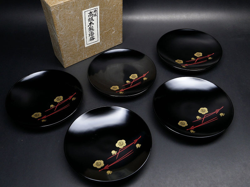 - 【結】未使用美品◆会津塗 木製銘々皿 梅黒漆塗 4.5寸 5枚組 ◆【レターパック対応可】