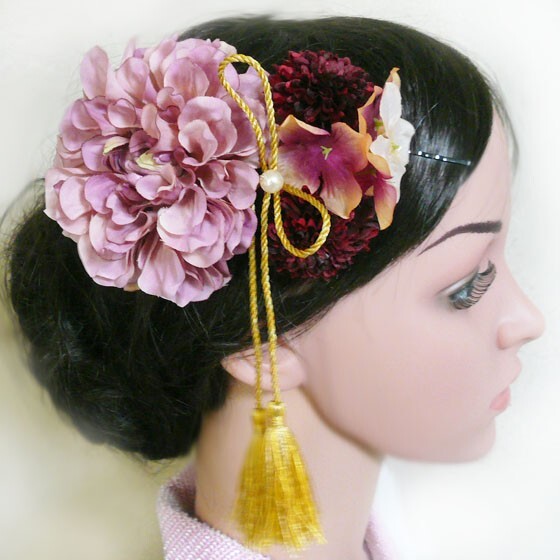 - 髪飾り 花 ダリアmoと菊房付 ピンク ワイン 成人式 振袖 結婚式 卒業式 袴 浴衣 着物 フラワー
