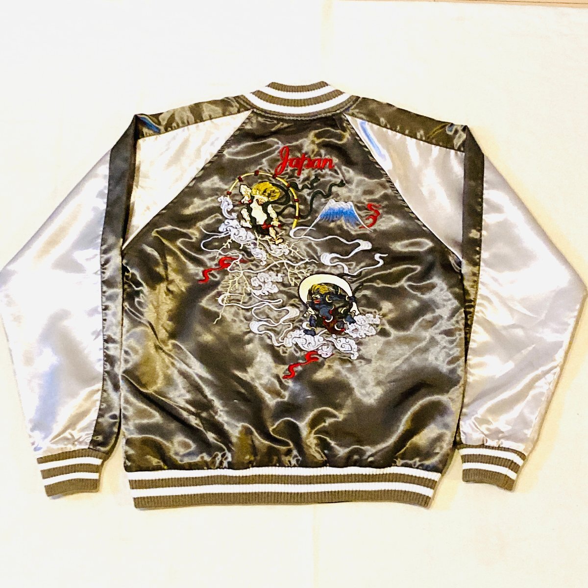 - 美品 光言 風神 雷神 和柄 刺繍 スカジャン リバーシブル カーキ系/薄金 L