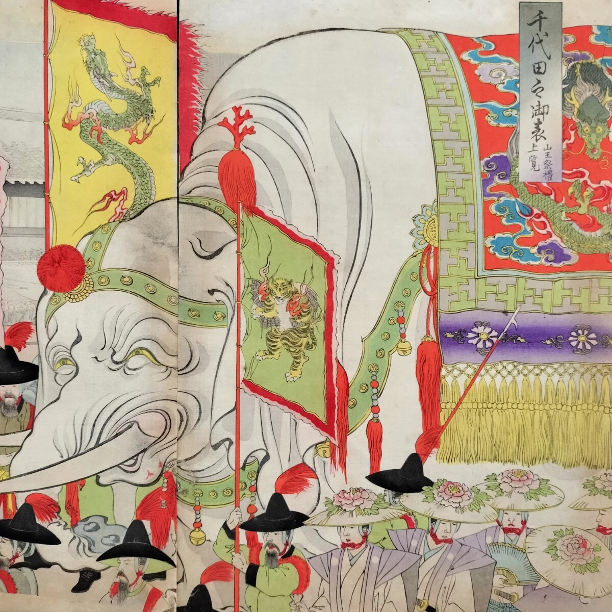 - 象!飛虎!龍!明治期/真作 楊洲周延「千代田之御表 山王祭礼上覧」本物浮世絵木版画 名所絵 錦絵 大判 三枚続き 裏打ち