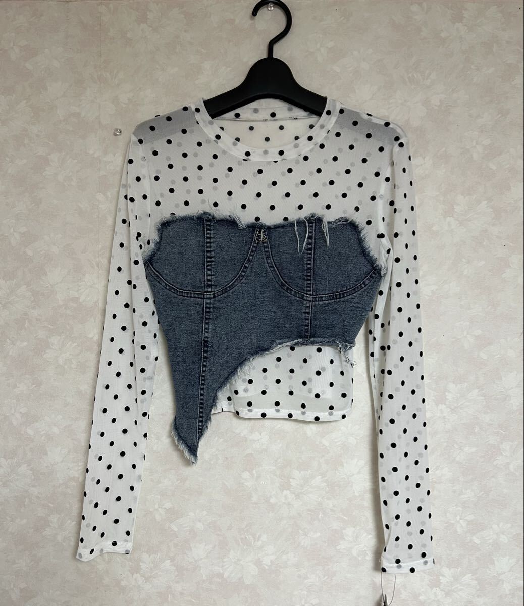 > 新品タグ付き ストレッチメッシュxデニム素材 ドッキングデザイントップス ドット シアーシャツ 長袖 M〜L トップス 薄手