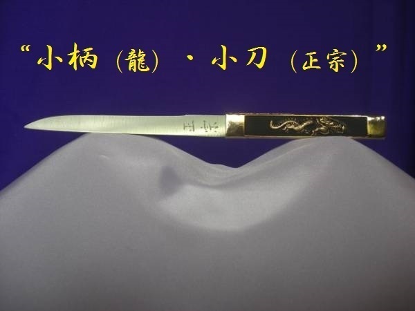 > 小柄【龍】+小刀【正宗】(刃文付、正宗銘入)刀身約12cm 魚子地 ★少々難有り(小刀の先に3㎝程白くクモリ有り)模造刀