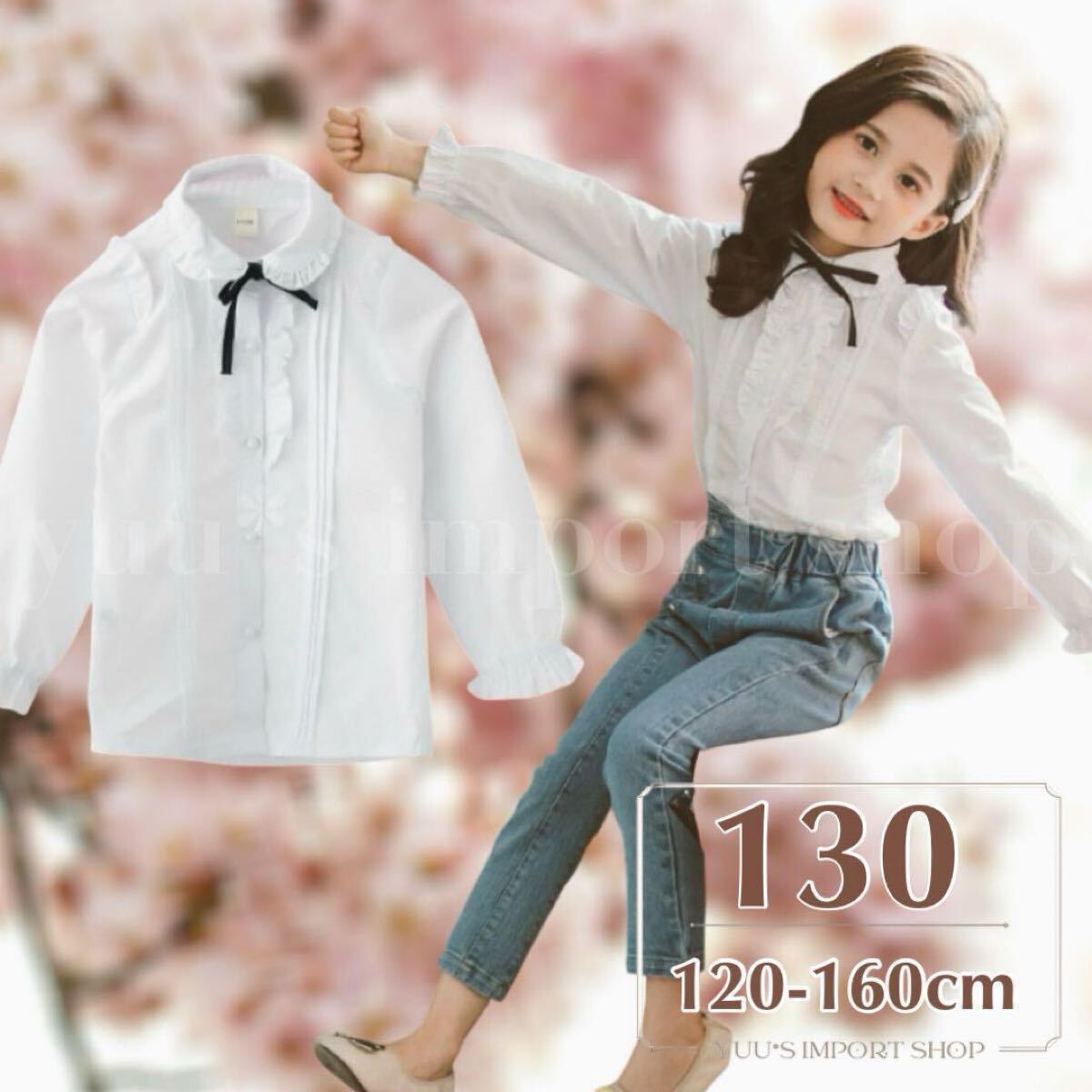 - シャツ 女の子 130 白 長袖 ブラウス フォーマル えり付き リボン フリル 発表会 入学式 卒園式 結婚式 姉妹コーデ お揃い