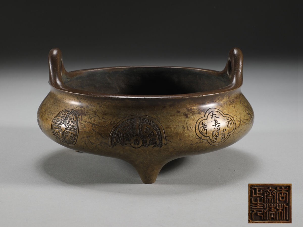 - 「清代 杏樸齋清正主人 古銅彫 沖天耳老銅香炉」旧銅器 置物擺件 賞物 中国古美術 旧蔵出