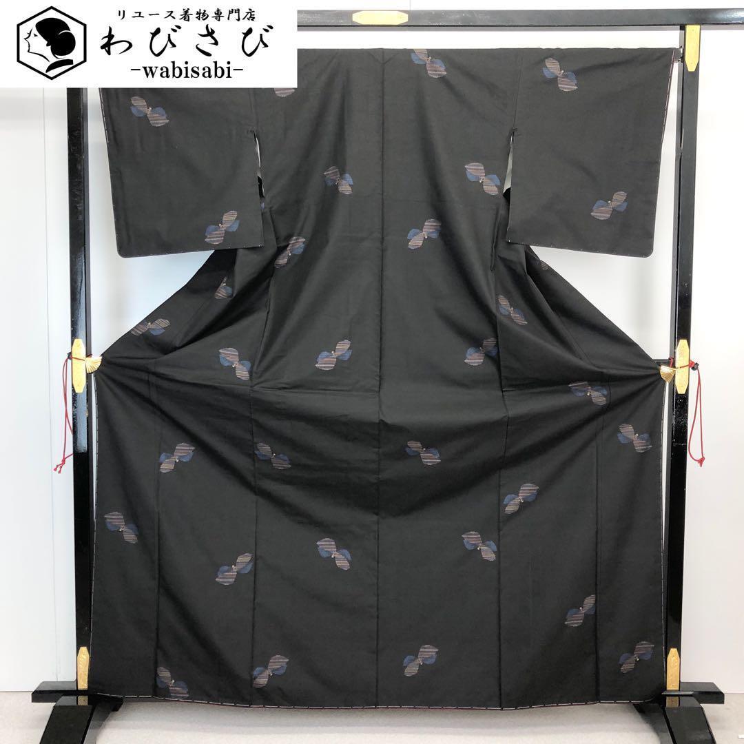 - 本場大島紬 地空き 蝶々柄 黒色 しつけ糸 トールサイズ K-4154 着物 きもの kimono 和服 和装 中古 リサイクル着物 【送料無料】
