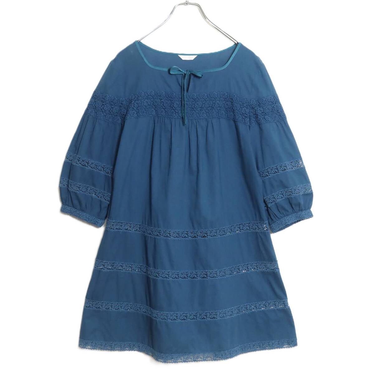 > ピンクハウス★ふんわりフォルムのローンブラウス チュニック 青緑系 ローズのカットワークレース♪サテンリボンも♪無地 z15187