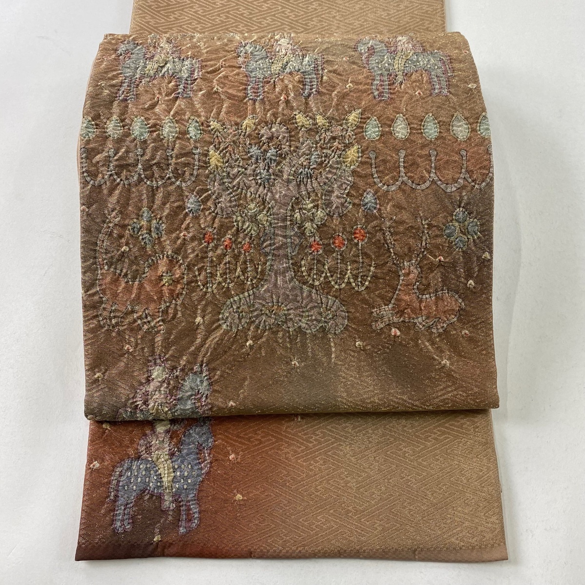 - 袋帯 美品 秀品 関西仕立て 動物 人物 金糸 ぼかし 薄小豆 お太鼓柄 正絹 【中古】