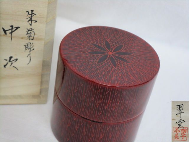 - 雉坂★【 朱 菊彫 中次 関翆雲 共箱 】茶道具・棗・薄茶器・抹茶入・山中漆器・山中塗