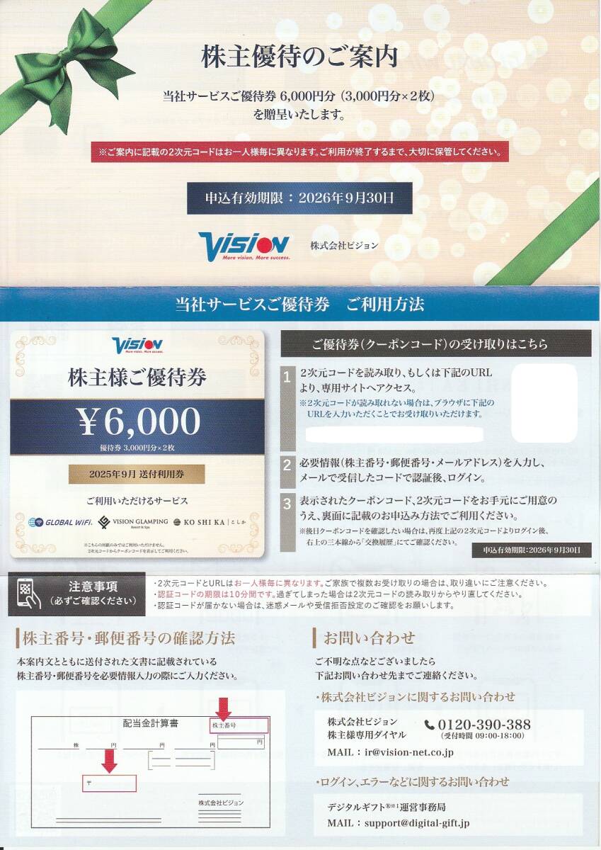 - 即発送 ビジョン 株主優待 グローバルWIFI 6000円分 ~2026/9/30 ※コード通知