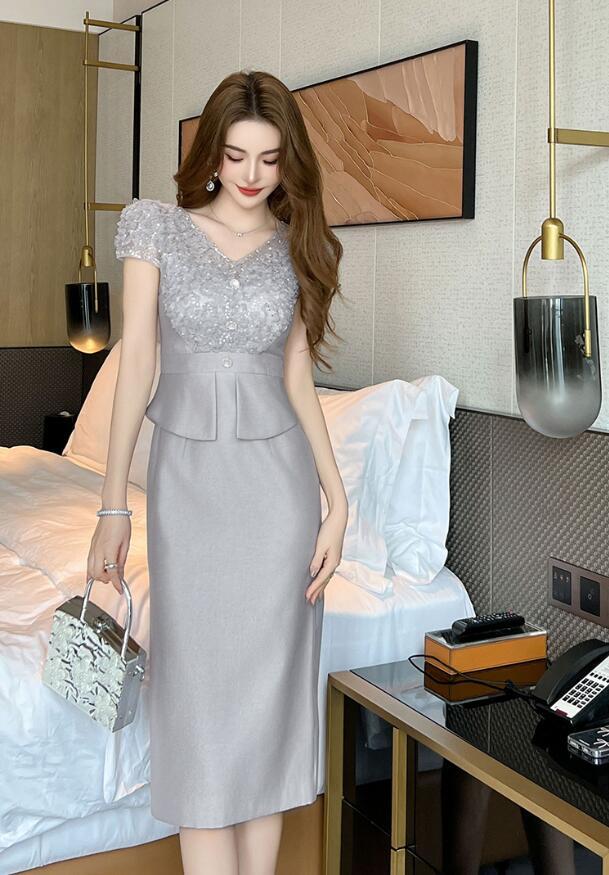 - 335 ワンピースladiesレディース ◇ 魅惑Styleセクシー ◇ sexy 披露宴dress ロング丈 半袖 グレー