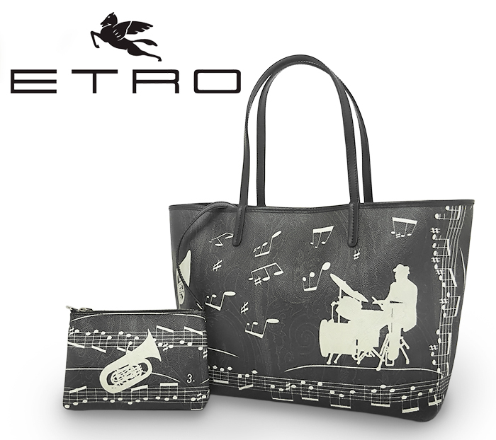 - 【超美品 ほぼ未使用】 エトロ ETRO トートバッグ ハンドバッグ ポーチ付 鞄 音符 音楽 ペイズリー レザー ブラック ホワイト 大きい 軽い