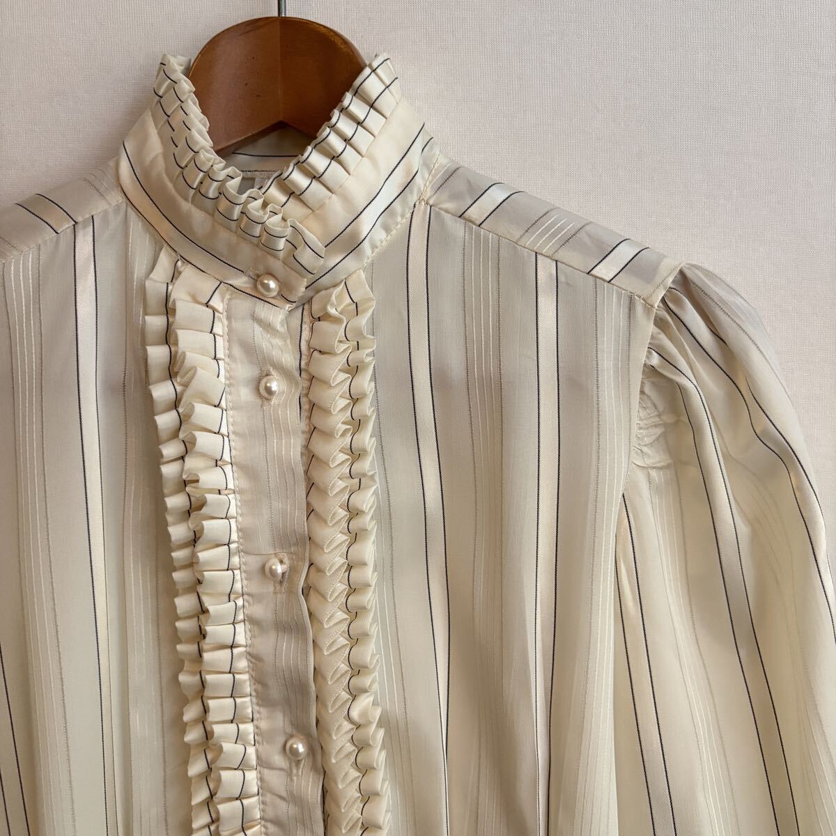 - ヴィンテージ 70s【フリル】立ち襟 ブラウス USA製 ストライプ 長袖シャツ ヨーロッパ アンティーク フランス レトロ レース クラシカル