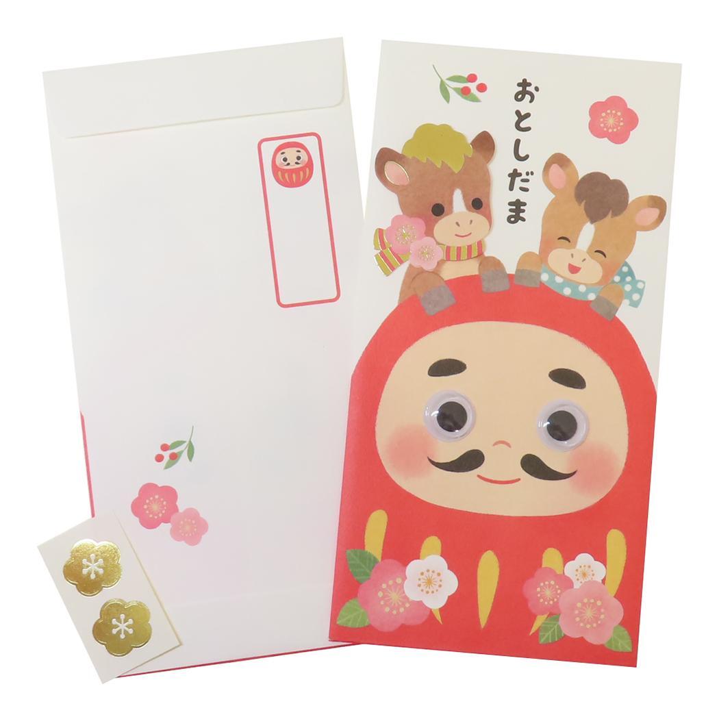 - ポチ袋 ハンドメイド年賀長ぽち袋 2枚入 だるま 目玉付 午 アクティブコーポレーション 封印シール2枚入 金箔 お年玉袋 金封