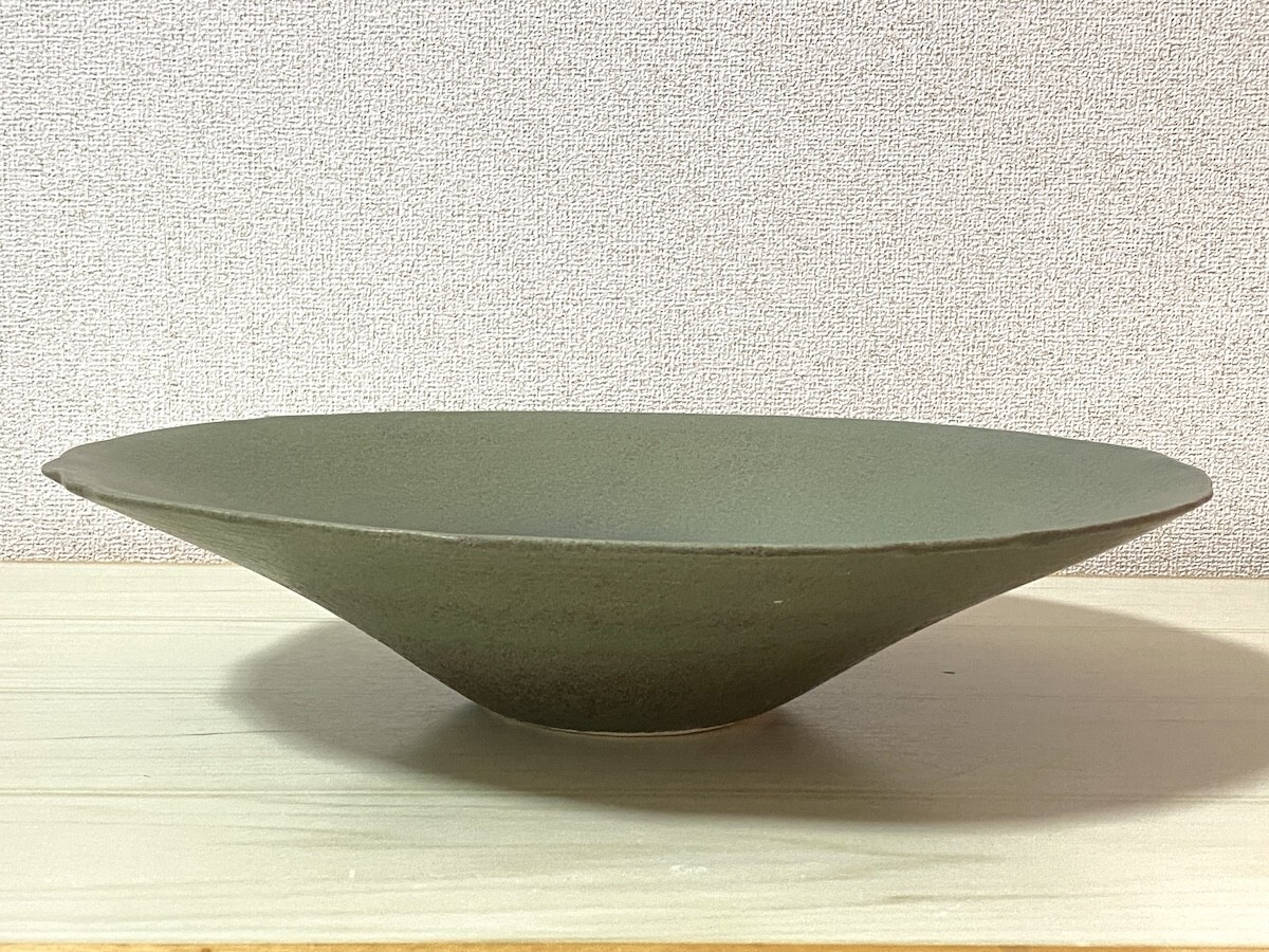 > 【KB139】陶器 大きめ 花器・水盤 緑地青茶 幅横38.5cm 高さ約9cm 重さ約1.6kg 陶磁器 焼物 花道 華道 花瓶 花入 花生け いけばな